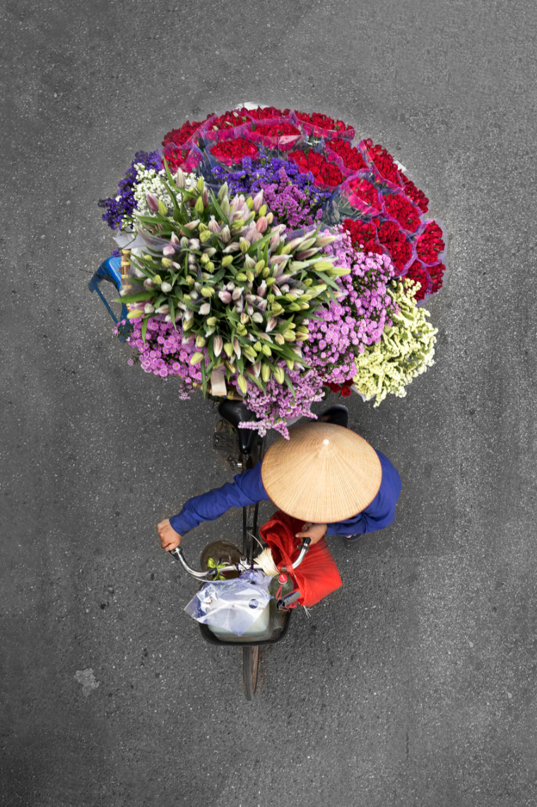 Standing amid the bustling streets of Hanoi’s Old Quarter is one of my fondest memories of Vietnam. Your senses are abuzz – and that’s not just the Vietnamese coffee kicking in. The smells from street food and the sounds of vendors is awakening. And bicycle after bicycle, packed high with flowers, vegetables and fruit, are like explosions of color whizzing by. It’s like nothing you’ll ever experience, which is why I absolutely love this series of bicycle vendors from above, photographed by Loes Heerink. The photographer posts up on different bridges around Hanoi to capture the vendors as they ride beneath her. Although there’s no shortage of bicycle vendors, you can imagine how much patience it requires to capture the right shot. Can you imagine toting around all of that beautiful cargo on a single bike?! Amazing.